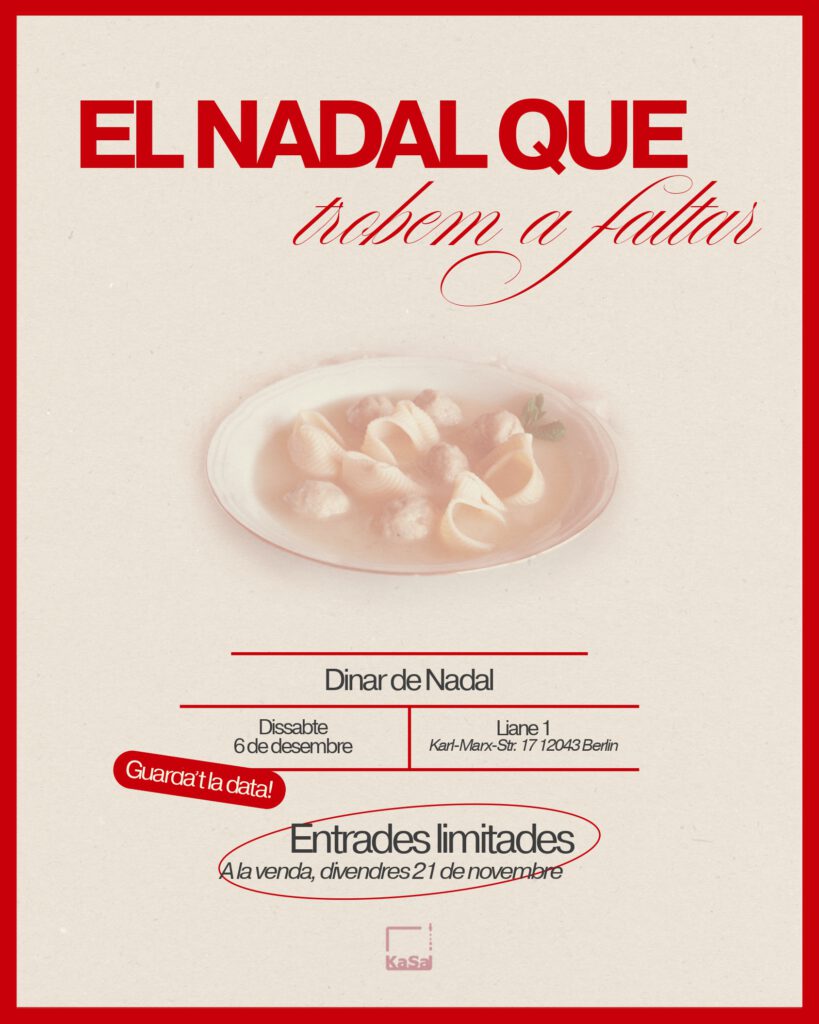 Amb motiu de les festes de Nadal, el Casal català de Berlín (Katalanischer Salon e.V.) us proposa de trobar-nos el dissabte 6 de desembre per fer un dinar de Nadal plegats a partir de les 13.00h al Liane (Karl-Marx-Str. 17,…