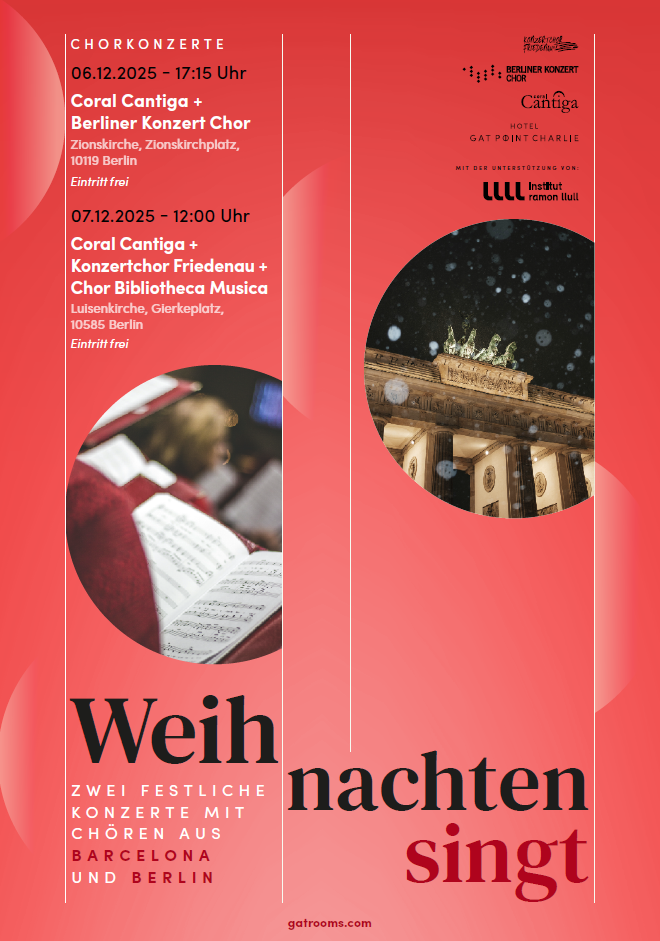 Der Coral Cantiga aus Barcelona singt gemeinsam mit den Berliner Chören: Berliner Konzert Chor, Chor Bibliotheca Musica und dem Konzertchor Friedenau zu zweifestlichen Weihnachtskonzerten. Diese musikalische Begegnung feiert die Verbindung zwischen den beiden Städten durch den Gesang und die gemeinsame Freude an der Weihnachtszeit.