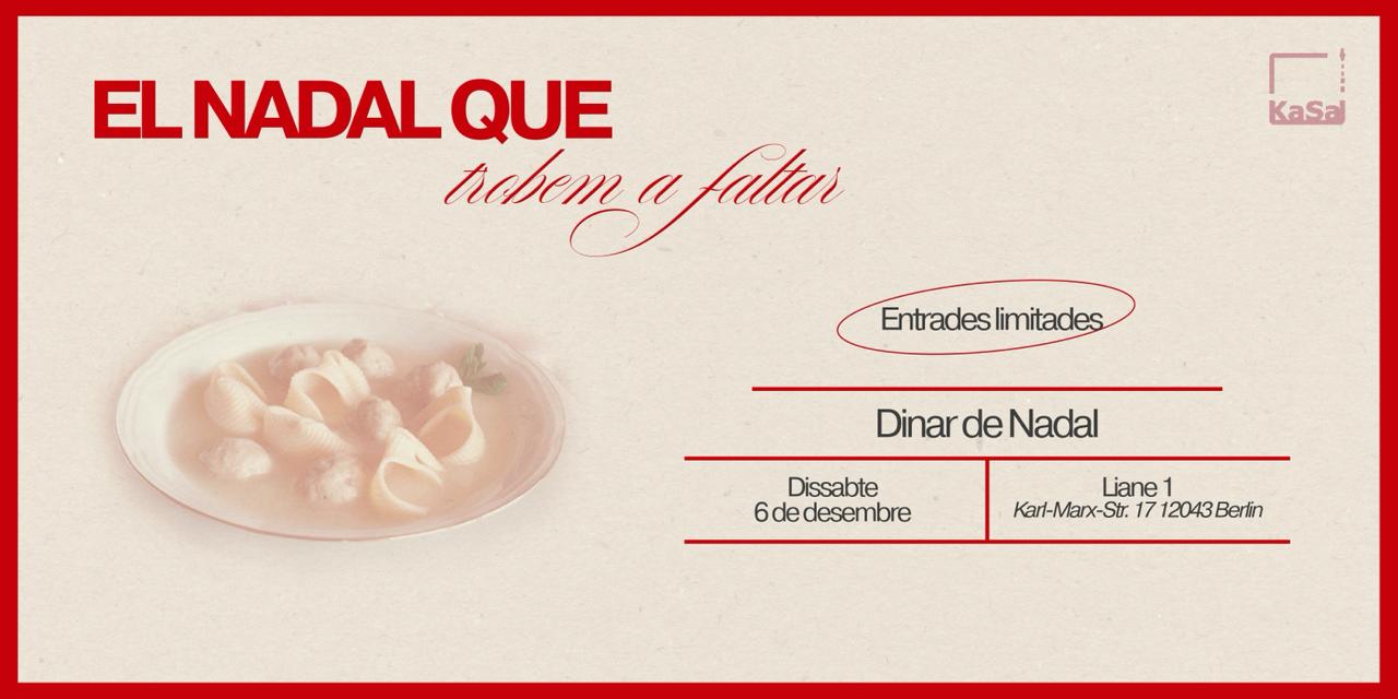 Amb motiu de les festes de Nadal, el Casal català de Berlín (Katalanischer Salon e.V.) us proposa de trobar-nos el dissabte 6 de desembre per fer un dinar de Nadal amb sopa de galets amb pilota, canelons i torrons, tots plegats a partir de les 13.00h al Liane (Karl-Marx-Str. 17, 12043 Berlin).